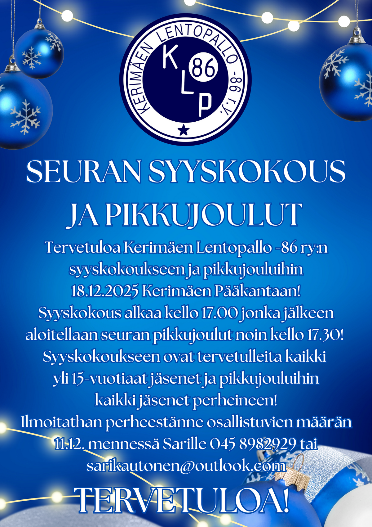 Lämpimästi tervetuloa Kerimäen Lentopallo -86 ry:n syyskokoukseen ja pikkujouluihin 18.12.2025 Kerimäen Pääkantaan!